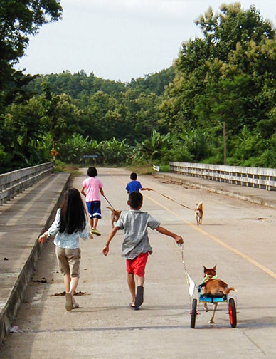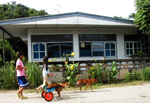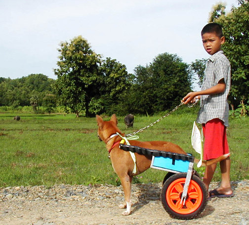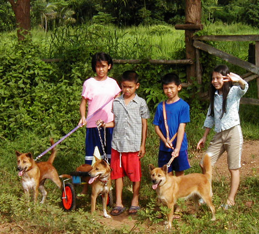 Ahn, one of our three dogs here in Pah Leurat, is a two-year-old Thai Ridgeback. During the Thai New Year celebrations last April a hit-and-run drunk driver broke Ahn's back, paralyzing both hind legs. When we arrived here from California in June we found Ahn confined to dragging himself around the yard, but otherwise happy and healthy, and eager to get back to running in the fields. With help from our vet in Santa Barbara, we discovered two excellent companies in America which make custom-fitted mobility carts for just such cases: K-9 Carts and Doggon' Wheels. Their $300 price tags, however, seemed out of place in a community where most human families are struggling to exist on $3 a day. We then found a veterinarian in Bangkok, the Ekamai Animal Hospital, which builds similar carts for around $60, but they insisted we bring Ahn to Bangkok and the 600-mile round trip with an incontinent dog did not seem a reasonable option. Finally, a friend in Chiangmai told us about a dog at her bank with a similar condition. One clever bank employee had designed a prototype cart and commissioned the auto upholstery shop next door to build it. Other bank employees contributed to the cost ($20 for materials and labor), and the result was a heartwarming success. So we took Ahn's measurements to Chiangmai and had a cart built for him there. Although it's not as refined as the pricey American models, and does not provide the important option to exercise his hind legs, at least it gets him out of the yard and back to the fields with his sisters. As the photos below clearly show, this cart has dramatically improved Ahn's life. He is also practicing walking on all four feet, with Yie holding his tail for balance, and our vet here feels there is a good chance for Ahn to eventually recover the ability to walk on his own. In any case, Ahn's accident and our response to it has made him something of a poster child in our ongoing campaign for speed bumps in Pah Leurat.
