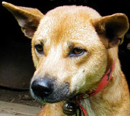 Follow-up, January 2004The cart we had built for Ahn last August provided every benefit we had hoped for and more. In fact, those two orange wheels helped him recover so much coordination and stamina that he is now walking on his own! Ahn still stumbles occasionally, and he still can't run or jump as well as he'd like, but at least he now no longer drags himself about. Instead he walks, maintaining a steady enough gait for long enough to work up a good pant. Ahn's spirits, front-end muscle tone and overall weight are all near normal. He is very glad to be alive, and eagerly expresses his heartfelt thanks to all those whose love and support helped make his story the happy success that it is. |