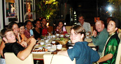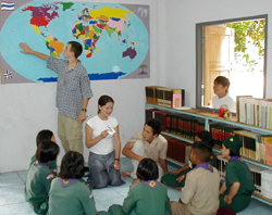 Uttaradit, June 25 July 11: Fresh with the monsoon rains, the mighty Nan River glides through a lush valley of rice paddies and tropical fruit groves. Thirty miles upstream from the provincial capital of Uttaradit, a rambling brick and teakwood home overlooks the wide, sparkling river. Bougainvillea climb the verandah; longan, mango and banana trees shade the yard. This is Boosaba's family home, a favorite hangout for local kids, and now our home in Pah Leurat, where we'll unwind after busy days teaching in the village school, and enjoy the genial rhythms of Thai country life. We'll ride bicycles and water buffalo, play soccer and ta kraw, paddle canoes and swim in the river, and help our new friends plant rice. During our stay in Pah Leurat we'll visit the nearby Lup Laea valley of legends, rare fruits and exquisite handmade fabrics. One memorable Saturday we'll join our Thai students on an excursion to the kingdom's original capital in Sukhothai where we'll picnic together among ancient ruins, towering Buddhas, and lotus-covered moats. On our final weekend in Pah Leurat we'll bid our friends a fond farewell with a sumptuous feast, karaoke and dancing. |